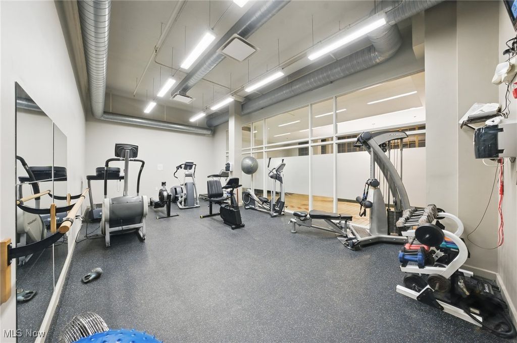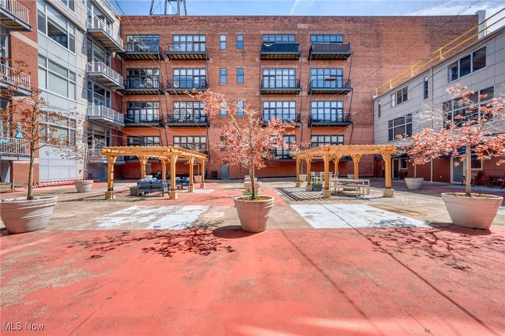 Incredible Top-Floor Skyline View Condo in the Iconic Fries & Schuele building! This 2-bedroom, 2-bath condominium offers one of the largest floorplans in the historic landmark building and comes with the luxury of TWO deeded, attached, covered parking spaces. Step inside and be immediately captivated by the soaring great-room ceilings, original 19th-century hardwood floors, exposed ductwork, and oversized windows that flood the space with natural light while framing UNBEATABLE views of downtown Cleveland and bustling West 25th Street. The updated kitchen blends historic character with modern style, featuring sleek stainless steel appliances, granite counters, a bar for seating, and a glass tile backsplash set against rich maple cabinetry. The spacious primary suite includes a walk-in closet and full bath, while the second bedroom and bath provide flexibility for guests or a home office. A convenient side-by-side washer/dryer is tucked away near the entry, complemented by abundant in-unit storage plus a dedicated, secure storage space in the lower level. Residents enjoy a worry-free lifestyle with amenities that include a private courtyard, 24-hour fitness center and inviting lobby. Just outside your door is Market Square, home to some of the city's best dining, breweries, and the iconic West Side Market. Located only 5 minutes from Downtown Cleveland and 15 minutes from the Cleveland Clinic and University Circle, this property perfectly balances history, style, and convenience.