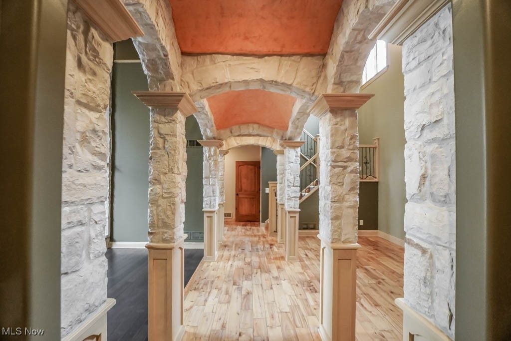 Blending European charm with modern sophistication, this Aberdeen Ridge home showcases exceptional craftsmanship and thoughtful design throughout. The stone exterior, turret, and arched entry set the stage for a remarkable residence. Inside, a grand two story foyer framed by stone pillars opens to an impressive great room with a floor to ceiling fireplace, dramatic lighting, and French doors leading to the patio. The kitchen is designed for both everyday living and entertaining, featuring granite countertops, stainless appliances, a copper range hood, custom cabinetry, and a generous island with seating. Just off the kitchen, the hearth room offers a comfortable place to gather with a stone fireplace and built in wine storage. A convenient main full bath and nearby laundry add to the home's well planned layout. The main floor hosts both the primary and junior suites, each with private baths. The primary suite is a true retreat with a fireplace, patio access, dual vanities, a jetted tub, and a walk in shower. Upstairs, three additional bedrooms and two full baths include a Jack and Jill layout shared by two bedrooms, along with a second laundry room and a balcony overlooking the great room. The finished lower level is made for entertaining, complete with a media area, full bar, and game space with walkout access to the backyard. A bonus room and full bath offer flexibility as a sixth bedroom or private guest suite. Outdoor living includes a fenced yard, nature stone patio, and wood fired pizza oven, perfect for gatherings. Set on a half acre cul de sac lot with full lawn irrigation, central vac, and zoned heating and cooling, this home delivers an ideal blend of elegance, comfort, and craftsmanship in one of Jackson's most desirable neighborhoods. Call to schedule your private tour today!