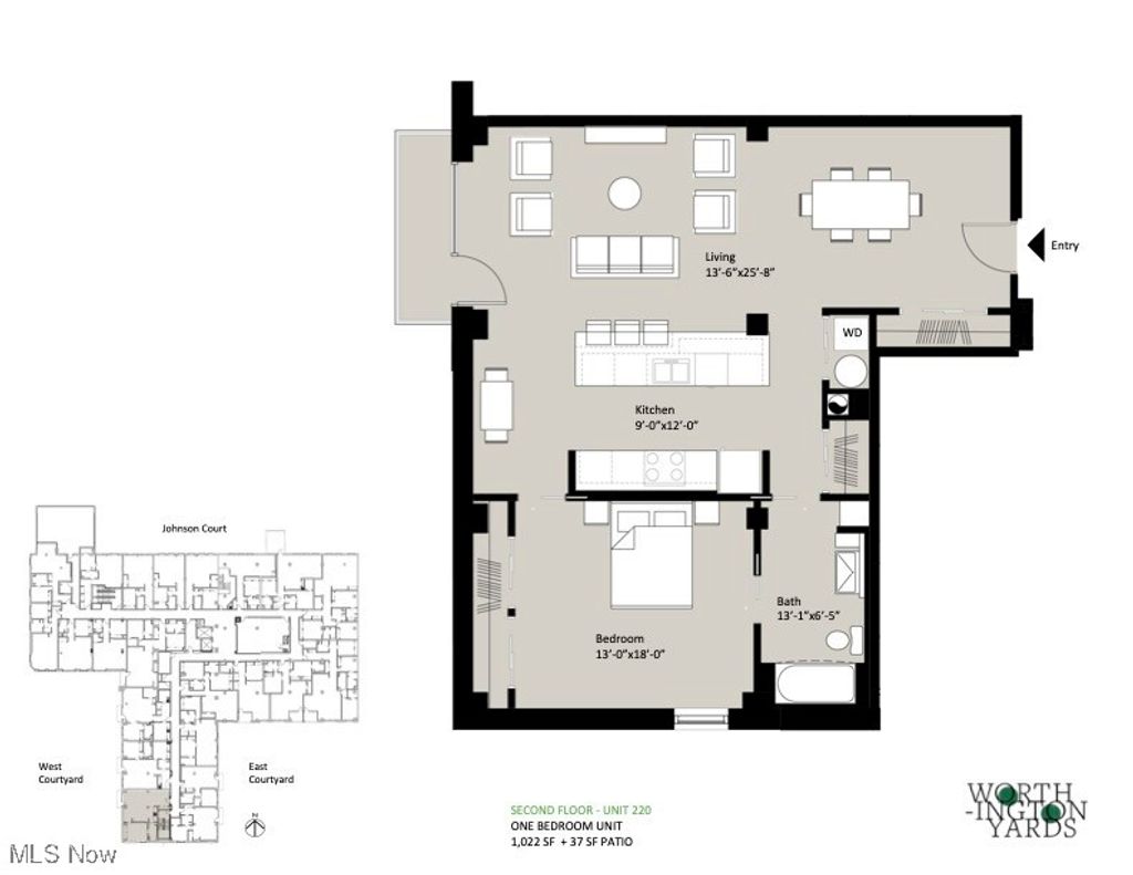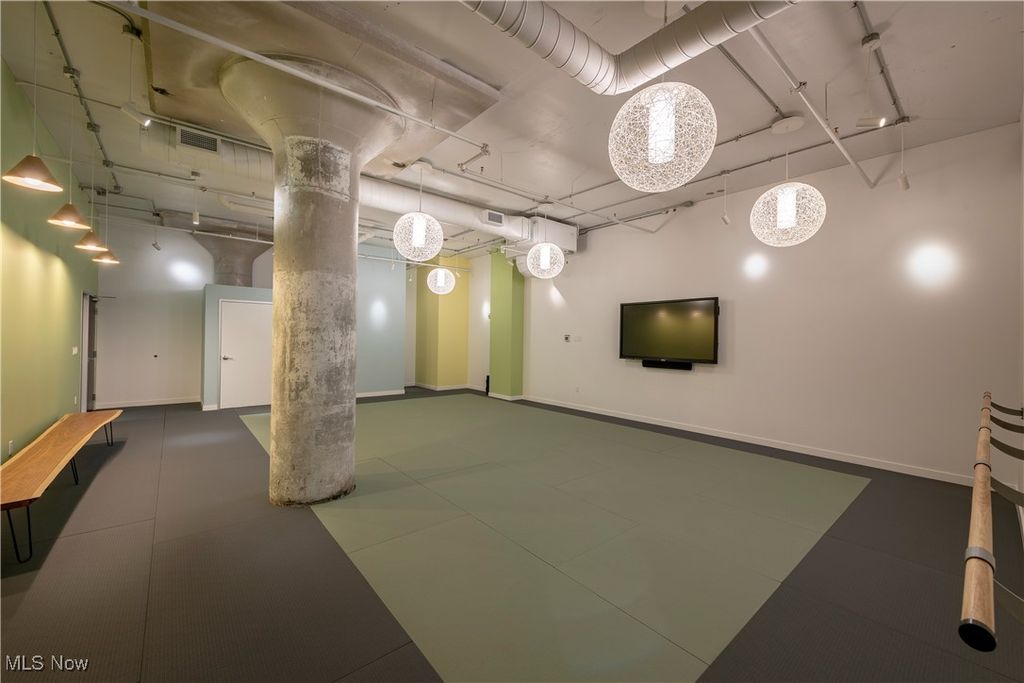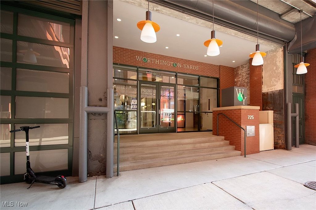 Enjoy urban living in this one-bedroom unit nestled within a meticulously restored historic warehouse conversion, Worthington Yards. Residents are surrounded by a curated art collection which extends from the lobby area throughout the entire building, including an on-site gallery with rotating exhibits and regular shows/events. Step outside your door into a spectacular, lush and secluded interior courtyard featuring an expansive lawn, grilling station, fire pits, and lounge areas perfect for relaxing or entertaining. Residents also enjoy access to a rooftop deck with city views, a second (pet-friendly) courtyard, a fully equipped fitness center, yoga room, and stylish community living rooms and workspaces. The character-filled unit features soaring ceilings, exposed brick, rugged concrete pillars and oversized windows which were added throughout the building during the restoration. The kitchen and bath are stylishly designed with functionality in mind and allow for easy living, working and relaxing. Located in Cleveland's highly walkable Warehouse District, you're steps from the city's best dining, nightlife, and entertainment"”plus easy access to The Flats and all of Downtown. Corner unit with West and South facing windows, patio overlooking the West courtyard.