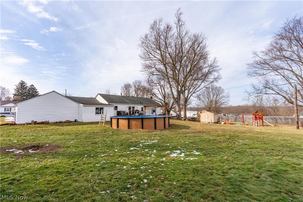 This beautiful ranch sits on a spacious .59-acre lot, offering the family-friendly comfort. From the moment you arrive, the charming front porch welcomes you into this bright 1,978 sq ft home. The spacious great room features wood floors and a large bay window. The open formal dining room features an impressive picture window that bathes the room in natural light. The eat-in kitchen boasts granite countertops, a breakfast bar, a tile backsplash, and a dining area with a built-in china cabinet and access to the back deck. Outdoor entertainment is made easy with the perfect spot for relaxation. The large fenced backyard includes a deck, an above-ground pool, a playset, and a shed for extra storage. The main floor features three generous bedrooms and a full bath with a tile tub shower combo and plenty of storage. The primary bedroom offers privacy away from the other 2 bedrooms and boasts dual closets and access to the attached 2-car garage. The partially finished basement expands your living space with a vast recreational room with a stone surround fireplace, a laundry area with a standing shower, and an additional full bath with a soaking tub. Recent updates include bathroom renovation, bedroom update, new dishwasher, back deck rebuilt, and an above-ground pool. Schedule your private showing today.