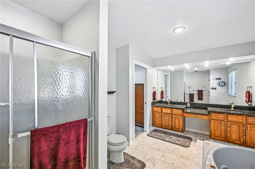 Phenomenal 4-BR, 4.5-bath home on nearly an acre on a quiet dead-end street in desirable Canfield Township, offering privacy with convenient access to shopping, dining, and major routes. Step inside to discover thoughtful updates throughout. The bright white kitchen features refaced cabinetry, granite countertops, new appliances, updated lighting, and a built-in desk. A formal dining room, private office, first-floor laundry, and half bath add functionality to the main level. The spacious family room flows into the kitchen, sunroom, and impressive great room with fireplace, wet bar, expansive windows, two sliding doors, and access to a wraparound deck ideal for entertaining or everyday living. The sunroom offers abundant natural light and connects to a walk-in pantry. Upstairs, the primary suite includes a marble bath with spa tub and separate shower. Two additional bedrooms with custom closets share a full bath. A standout feature is the private west wing offering flexible living space with its own living room, dining area, kitchen, full bath, spacious bedroom with double closets, basement access, and connection to the great room, ideal for extended living or guest space. The finished lower level includes a recreation area with wet bar, exercise space, full bath, and two large storage rooms. A rare combination of space, flexibility, and updates in a prime location. Highlights: Heated 3-car garage with epoxy floor, wraparound deck overlooking wooded backyard, landscape lighting, functional shed with overhead door, new front and side doors, central alarm, central vacuum, zoned heating with three furnaces and UV system, whole-house surge protector, and intercom system.
