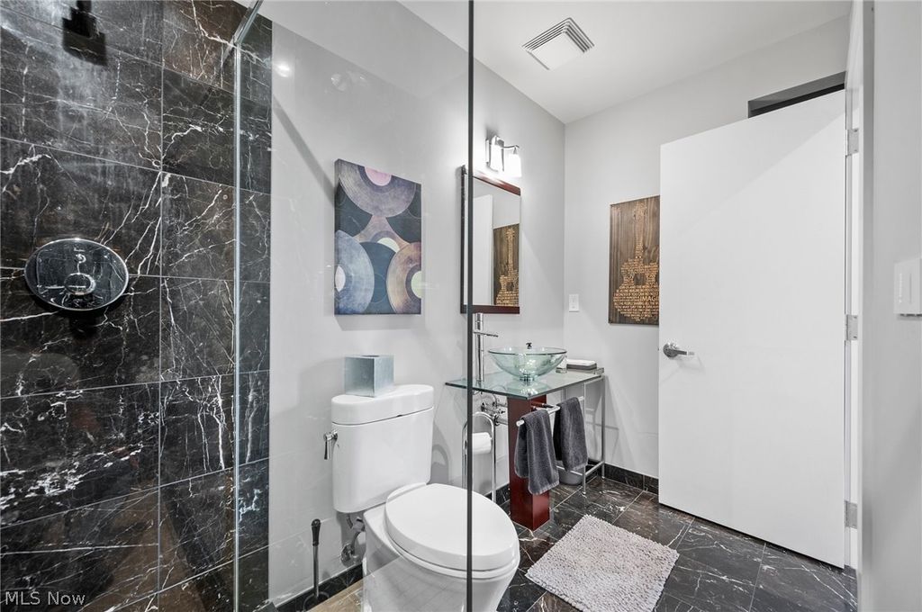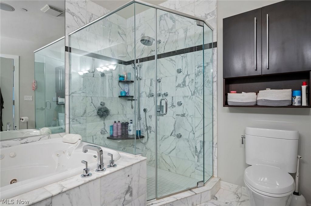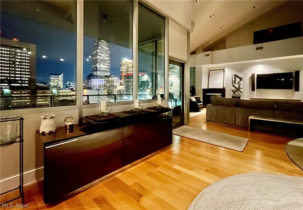 A million-dollar Penthouse view. 10' walls of glass invite you into the Cleveland skyline the moment you walk in the door. It's the best view in the building, with the whole downtown skyline right in front of you. And the 21' ceilings and a Richard Fleischman designed interior are no less spectacular than the view. An architectural tour de force defines the huge living space into five distinct living spaces. A round dining room takes shape under a floating circle of lights as the centerpiece of the main floor. The living room has lake and skyline views on one side, and has a granite fireplace, a media wall and a wet bar on the other. The den/bar (which is by design convertible to a 3rd bedroom) has the best views of all. It looks panoramically from the eastern shoreline all the way across the city toward Public Square. And it has a full black marble bath off its hallway. The first floor finishes up with an elegant study that has floor to ceiling mahogany bookshelves, including additional wine storage. The recently renovated kitchen mirrors the curving walls with its own gracefully curving island and breakfast bar in elegant grey marble. The entire unit has been redone from top to bottom, tastefully appointed in elegant soft greys and white. A dramatic floating staircase takes you to the second floor where two bedrooms with plate glass walls overlook the main living space. A contemporary guest bedroom is at the top of the stairs, with its own marble bathroom. And the large master suite completes the whole design with sweeping semi-circular walls, a spectacular Italian marble bath, and a double dressing room that takes the concept of a closet to a whole new level. There are walls of racks and custom shelving, as well as ample drawers and cabinets. The large terrace's commanding views of the water & skyline is well enough sheltered to tempt you to step out year-round - and the absolute place to be for summer. Full Pinnacle Amenities. Open this Sunday, 2/22, 12:45-2:45.