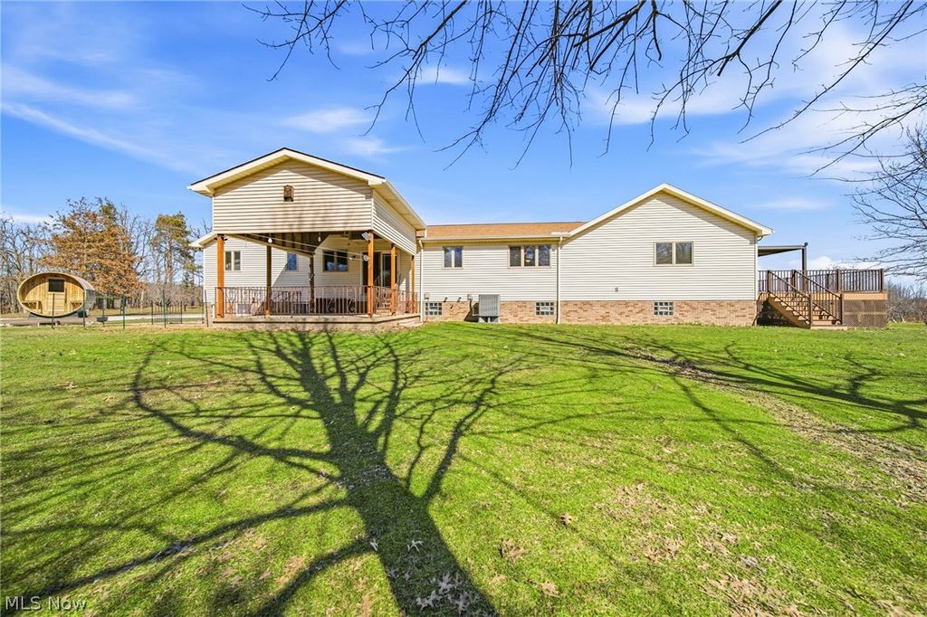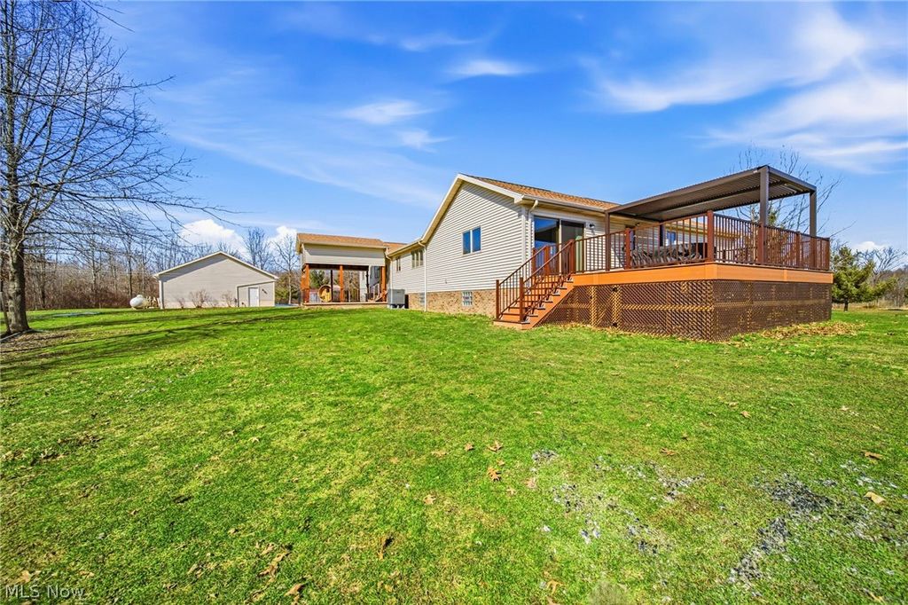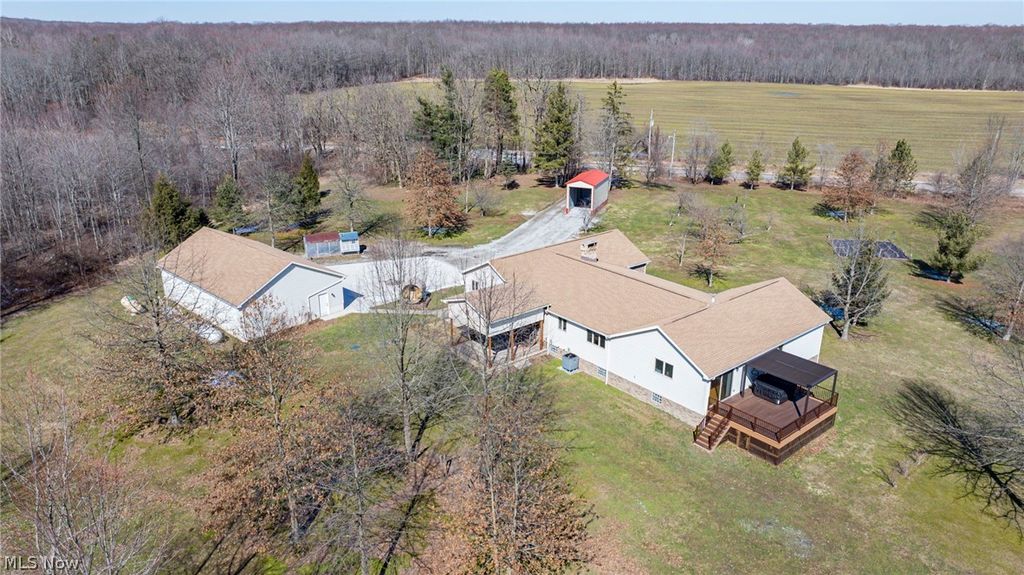 Beautiful custom-built ranch on private 10-acre lot, offering peace, privacy, and exceptional craftsmanship. This 3-bed, 3.5 bath home is truly a private getaway. The primary suite provides a peaceful retreat with recently added patio doors that lead out to the Fiberon composite deck with Trex aluminum railing and pergola along with a newer Marquis Crown hot tub overlooking the lovely pond, all added in 2025. Convenient first floor laundry. Kitchen updated Spring 2021 with quartz countertops and oak cabinetry, matching oak woodwork in the home. Roof replaced 2019. Hardwood floors and tile run throughout, complemented by wide 36" doorways. The expansive living room centers around a wood-burning fireplace with new liner 2022, with an additional wood burner in the basement; primary heat is a propane furnace and heat pump. All stainless steel kitchen appliances remain. The full, unfinished basement offers enormous potential for additional living space and includes a large 31' x 5' cold storage room, plus a newly added half bath with Saniflo up flush system 2023. Outdoor amenities are just as impressive. Enjoy a 2-car attached garage, plus a 30' x 48', 3-bay detached garage/shop with added electric, sub panel, and 30-amp service 2024, and fresh concrete pad 2025. A newly constructed pole barn with custom bay door 2024, windmill for pond aeration 2025, fruit trees, blueberry bushes. The pond serves as the home's water source, adding to the natural beauty of the setting. High-efficiency furnace with heat pump & AC 2025; sauna 2022, whole home generator 30 amp switch 2023, fiber optics 2025. This property is absolutely stunning and offers a rare combination of luxury and seclusion. A hunter's and/or homesteaders paradise or your own private Country Oasis. Sale includes the home with 10 acres, and the additional 40 acres being separated with survey to convey at closing. See separate MLS listing for home with entire 50 acres.