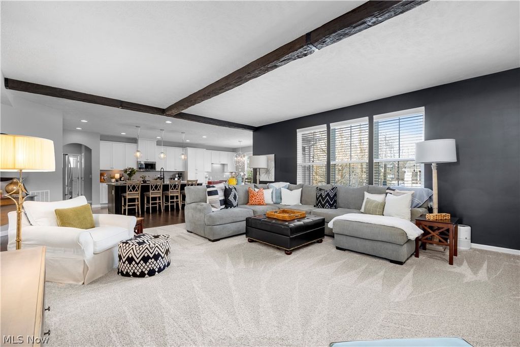 Welcome to this beautifully maintained 4-bedroom, 3.5-bath Colonial in highly desirable Avon with award-winning Avon City Schools. Offering over 4,000 square feet of finished living space including a finished lower level, this home combines timeless character with modern comfort. The main level features a spacious great room with a stunning stone fireplace and beautiful wood beams, creating a warm and inviting focal point. The eat-in kitchen boasts a large island, ample cabinetry, and hardwood flooring, flowing seamlessly into the formal dining room with tray ceiling. A first floor dedicated workspace is located in the office. A convenient main-level half bath and functional layout make entertaining effortless. Upstairs, the generous primary suite offers his and her walk-in closets and a private bath with a Roman tile shower and water closet. Three additional bedrooms and a full bath provide plenty of space for family or guests. The finished lower level expands your living space with a large recreation room, dedicated workout area, and additional full bath, ideal for entertaining, hobbies, or flexible living needs. Situated on a cul-de-sac in a desirable community with a pool, playground and professional management, this home offers comfort, convenience, and curb appeal. Three-car attached garage, central air, and thoughtful updates include: new living room carpeting in 2025 and a new sump pump in 2026. Don't miss this opportunity to own a spacious, move-in-ready home in one of Avon's most sought-after neighborhoods