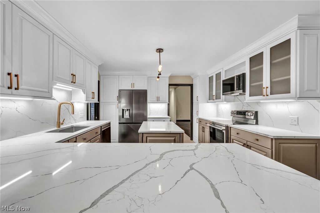 Remodeled luxury home located on a premium cul-de-sac lot in the highly sought-after gated community of The Village in Beachwood. Offering approximately 3,500 sq ft above grade and over 5,700 sq ft of finished living space including the finished lower level, this home showcases a chic modern design with high-end finishes throughout. The stunning designer kitchen features custom cabinetry, quartz countertops and new stainless steel appliances, and opens to a bright dining/morning room with a wall of windows overlooking the yard. The home offers beautiful oak hardwood floors, travertine tile and oversized ceramic tile flooring in the kitchen, along with fresh paint and new light fixtures throughout. The first-floor owner's suite features vaulted ceilings and sliding glass doors leading to the back deck. The private bath includes a custom ceramic tile shower, Jacuzzi soaking tub, double sinks, a vanity area and a large walk-in closet, creating a spacious and luxurious retreat. The vaulted great room features oak hardwood floors, a dramatic floor-to-ceiling marble gas fireplace, a built-in bar perfect for entertaining, and several sliding glass doors that provide abundant natural light and access to the back deck. The main level also includes a first-floor laundry room for added convenience. Upstairs there's new carpeting and two spacious bedrooms each with their own private full bathroom, along with a large loft that could easily be converted into a fourth bedroom, exercise room or home office. The finished lower level offers tremendous additional living space with a huge recreation room and an additional half bath. There is a whole House generator and an attached 2 car garage. Conveniently located just minutes from Beachwood Mall, Legacy Village and Pinecrest, offering some of the area's best shopping, dining and entertainment.