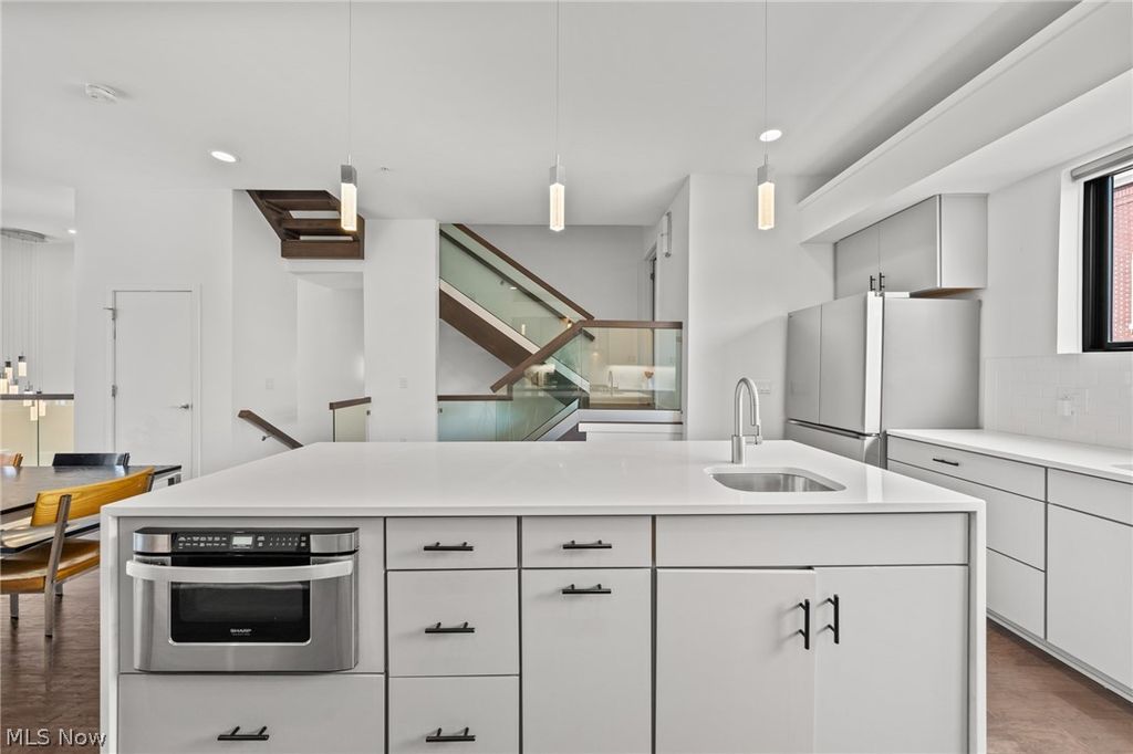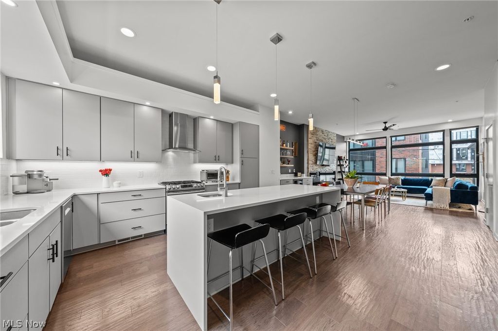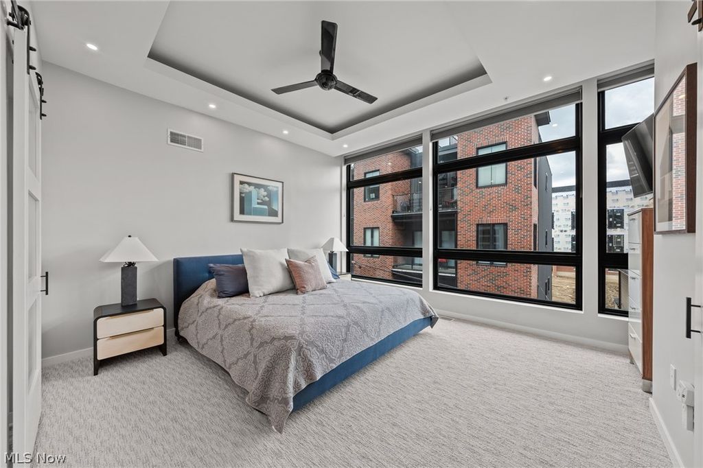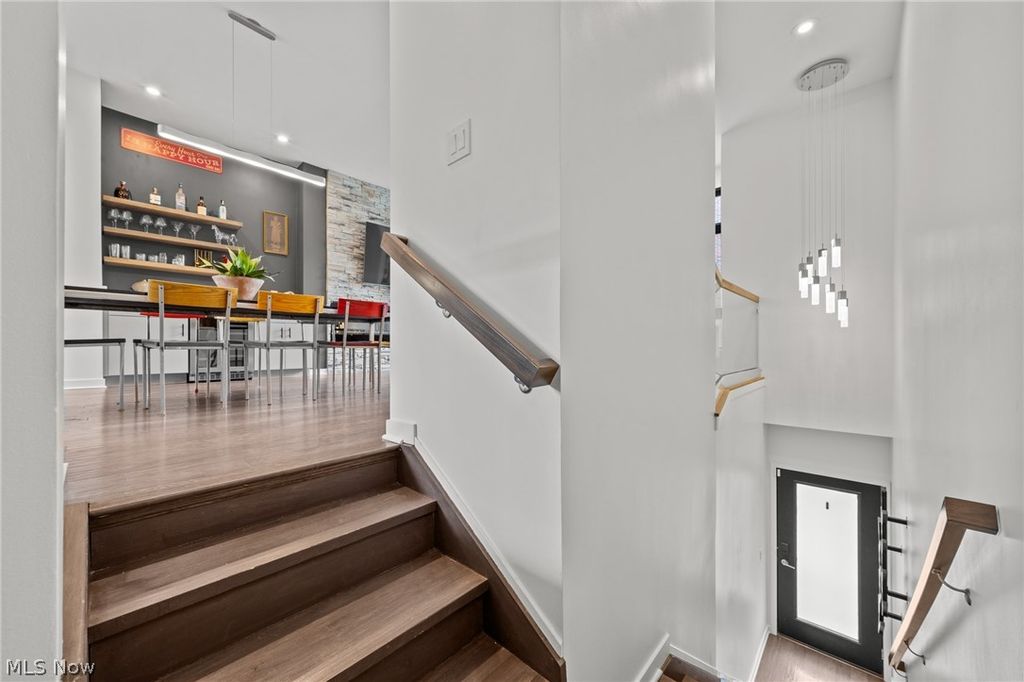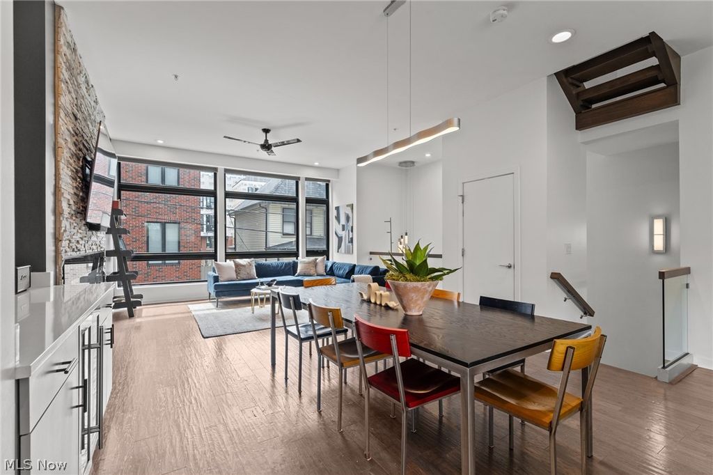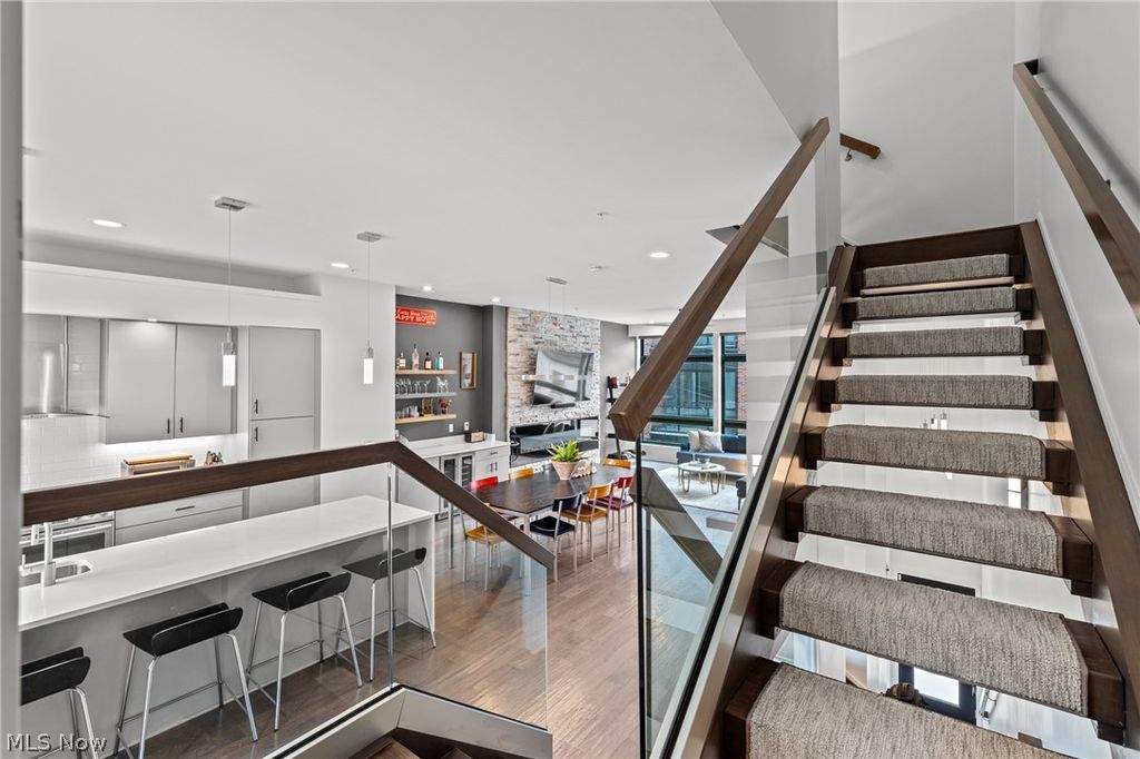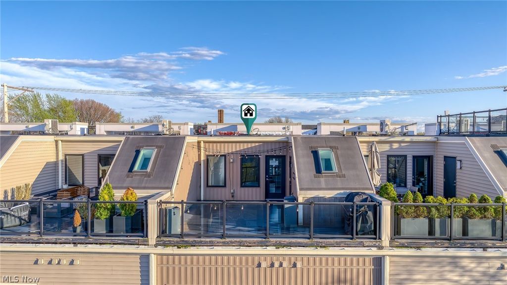 A location and townhome truly second to none! Tax abated through 2034! From the moment you step inside and ascend to the living area, you'll be captivated by a luxurious open-concept floor plan designed for everyday living and elevated entertaining. The sun-drenched living room anchors the space with a stunning stone fireplace and massive windows that bathe the room in natural light. The adjacent dining area features a built-in beverage fridge and custom cabinetry, while the well-appointed kitchen impresses with quartz countertops and premium stainless steel appliances. A convenient half bath is tucked on the stair landing for guests. Head up to the third level where brand new carpet sets the tone for the private quarters. An expansive primary suite is framed by dramatic floor-to-ceiling windows and features a generous walk-in closet and a spa-inspired ensuite bath complete with dual sinks and a beautifully tiled shower. A second full bath with a tiled tub/shower combo and quartz vanity serves the additional bedroom, which offers large windows and a walk-in closet. A dedicated laundry room with a front-loading washer/dryer combo completes this level. On the fourth level - also finished with brand new carpet - a spectacular room awaits, complete with a beverage fridge, a half bath, and access to the breezy rooftop deck. Your personal front-row seat to Cleveland's skyline, Lake Erie, summer fireworks, and the legendary Cleveland Air Show. Sunrises and sunsets have never looked so good. Back at ground level, a versatile bonus room opens to the enclosed backyard and two-car garage - a showstopper featuring a sleek polyaspartic-coated floor and impressive storage system. Step outside to the backyard, where brand new artificial turf offers a low-maintenance outdoor escape. All TVs convey! Move to an area that just keeps getting better every year (Irishtown Bend is next and new restaurants opening all the time!). The most walkable location you can dream up.