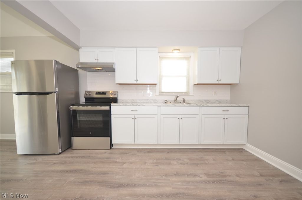 Completely remodeled Cuyahoga Falls cape in a prime location to easily get to the new Schools as well as nearby shopping and restaurants! It looks, feels and smells like a brand new home when you walk inside! Brand new flooring and paint throughout the home starts in the living room with built in shelving, decorative spindles on the staircase and access to the completely remodeled kitchen with new LVP flooring, cabinets, countertop, subway tile backsplash, GE Range and LG Refrigerator. It is such a spacious kitchen and even has a nice pantry closet for storage- plus a nice eating area w sliding glass door to the back yard and access to the 1st floor laundry/mud room. The convenience of the mud room and large dining area is made possible by an addition to this home that most of the capes don't have. Brand new flooring and paint continues in the first floor bedrooms and the spacious full bath including a gorgeous 2 sink vanity, new shower/tub w decorative surround and all new flooring, fixtures, commode and more. The large 2 sink vanity is another hard to find feature! Upstairs are 2 more bedrooms with good head room and all new flooring and paint- one featuring a cedar closet and the other featuring built in shelving plus hallway built in drawers. There are numerous closets throughout the home for storage space. Updates include: "˜26 Kitchen, Bathroom, Carpet, LVP flooring, 6 Panel Interior Doors, A/C, Hot Water Tank, Range, Refrigerator. "˜21 Furnace. "˜20 Dimensional Shingle Roof. Even the double hung windows are updated- nothing to do here but move in and relax!